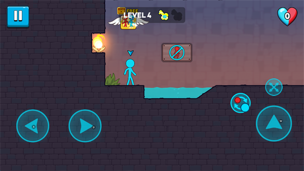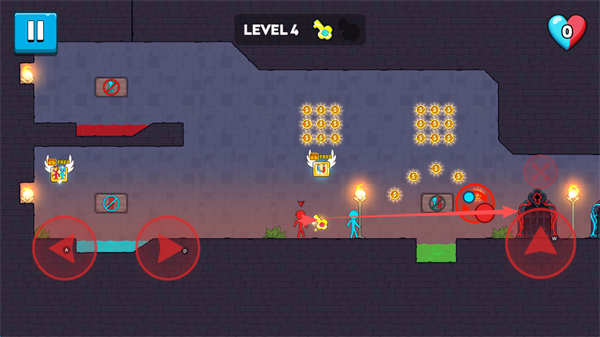 • 通过箭头移动红棒和蓝棒并避开障碍物。红棒必须避水,蓝棒必须避火。