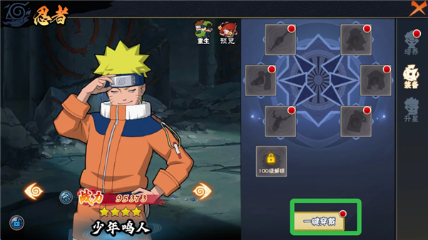将普通装备合成升级至下忍、中忍、上忍等,也可以快速提高装备的各属性。