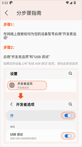 1、启用设备的开发者选项,一般是在设置界面中连续点击版本号五下或七下,也可以自己在网络上搜索自己的设备型号的开发者选项启用方式