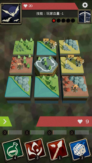 9个地块,中间为玩家地块,每个地块右上角为地块属性,左下角为地块元素,玩家可以点击相克或相同地块,成功点击则累计地块对应元素,累计元素可以使用对应技能