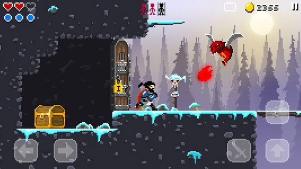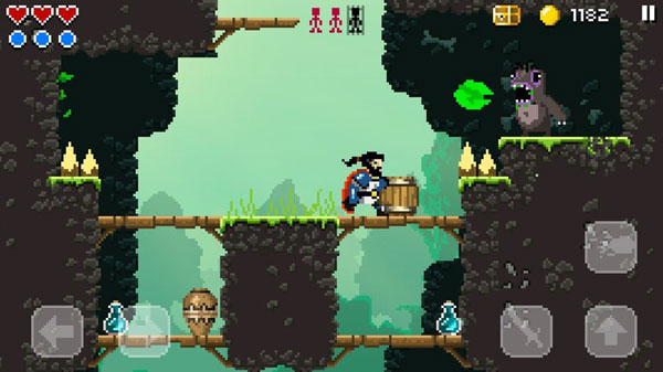 我先来说说游戏的操作吧,游戏的左边是左右方向键,右边是挥砍和跳跃键、释放魔法,最初的几个关卡我们只能简单地攻击,到了后面学会魔法之后就能使用火球术之类的技能了,游戏的操作总体来说还是非常的简单控制起来也不难,更大程度上考验的是我们对关卡地形和一些细节的操作。