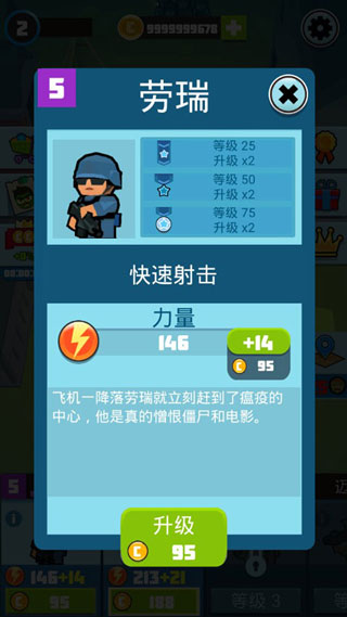 通过消灭僵尸或者是搜集地图中的金币,亦或者是完成每日奖励领取和挑战任务都可以获取大量金币,金币可以用来提升生存者的能力。