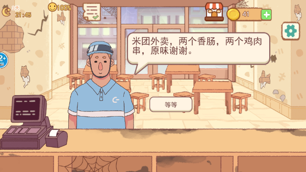 1、在本站下载该游戏打开进入,你会看到房东来收租,此时你要说消消火,她就会点些烤串来吃。