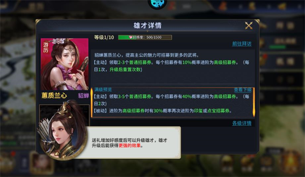 5、送礼增加好感度后可以升级雄才,雄才升级后能获得更强的效果。
