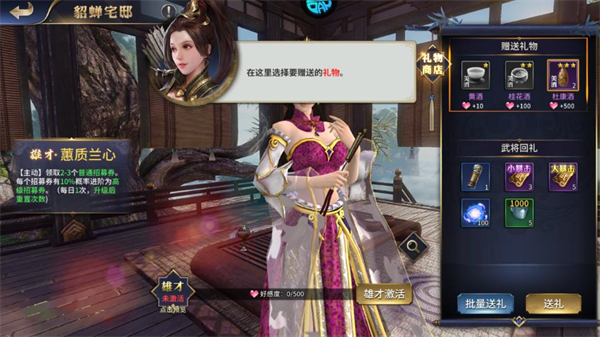 2、送礼可以提高武将对城主大人的好感度,好感度越高,武将就可以更好地发挥雄才为城主大人所用。