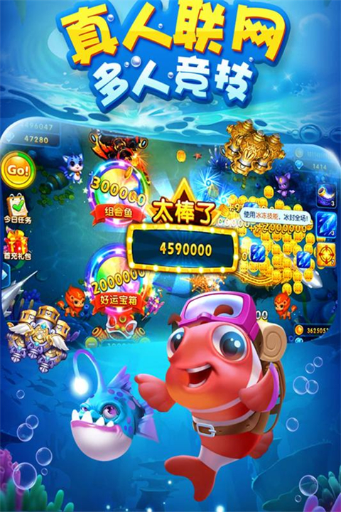手机平台首款真人联网捕鱼游戏,自由选择房间,与真实玩家同台斗技赢大奖!