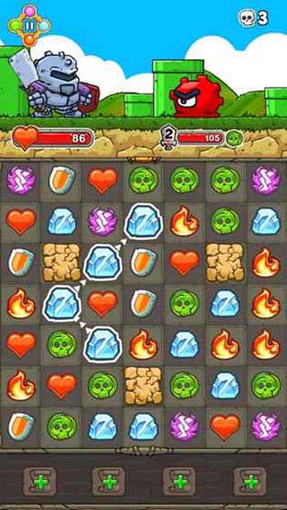 3、战胜敌人,游戏采用了消消乐的玩法,不同于消消乐的是可以拐弯连,只要是用一线连到底的就可以。