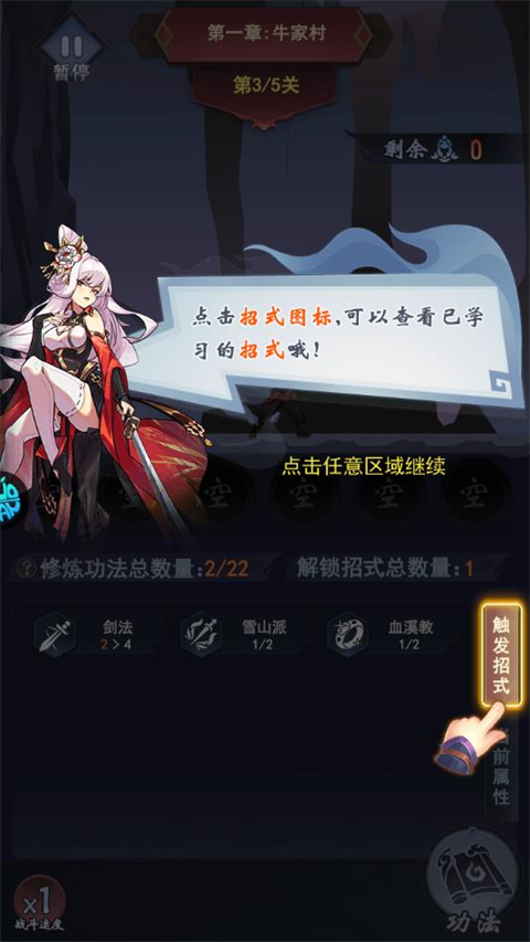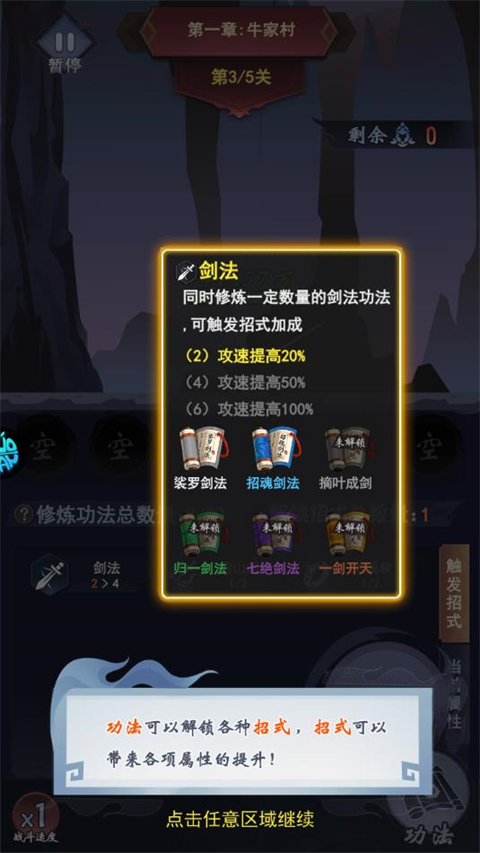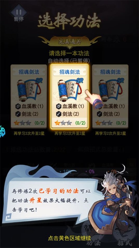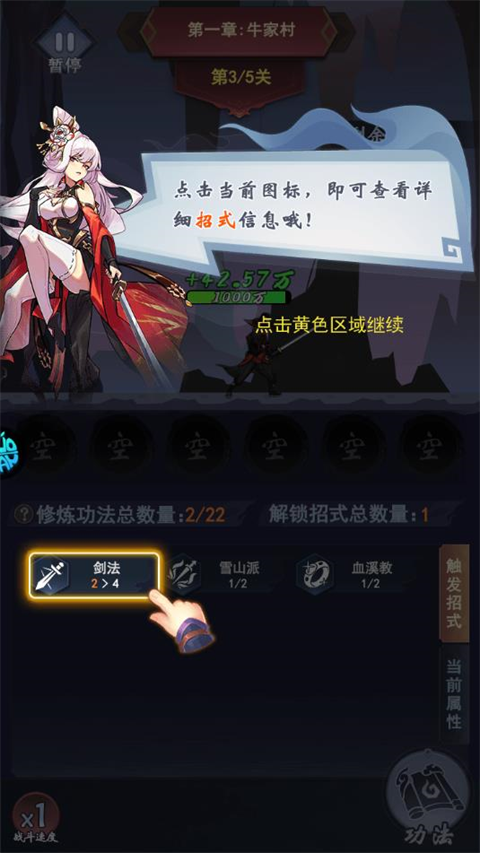 1、每通过一关,都可以任选一门功法 提升侠客属性!(已经拥有的功法才会出现哦)