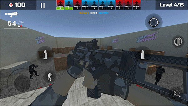 而在玩法上,游戏内现有经典模式和枪战模式两种,在经典模式下,有两支队伍,每支队伍的主要目的是击败敌人,玩家可以展示自己的技巧和速度,或使用战术。而在枪战模式下共有16 个级别,每个级别都有特定的武器,最先完成最高级别的玩家获胜。喜欢的朋友不妨下载试试看,相信一定不会让你失望的。