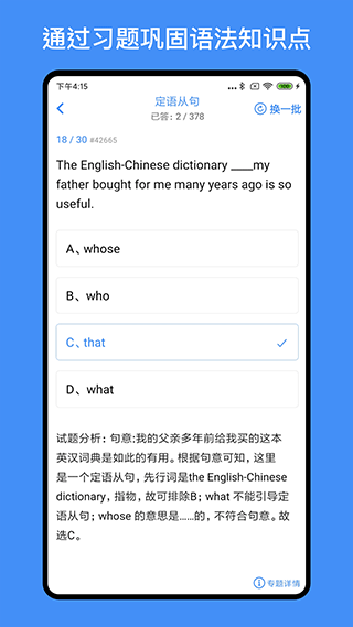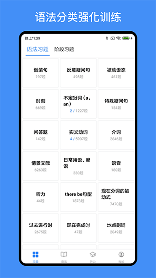 我的英语练习册app是一款优质的英语学习软件,致力帮助用户更高效的学习英语。软件为用户提供了各个阶段的英语教学资料,内容包含了语法、词汇、听力等,让用户可以全方位的进行学习。通过循序渐进的方式一点点的掌握,满足你在不同阶段的需求,并且从单词到语法、从课本重点到易错难点等等都为你归纳梳理,设置讲练结合的内容及语法强化集中练习,以上万道语法题集中训练的形式,帮助考生巩固英语语法,从而实现英语成绩的提升。有需要的小伙伴们快来下载吧!