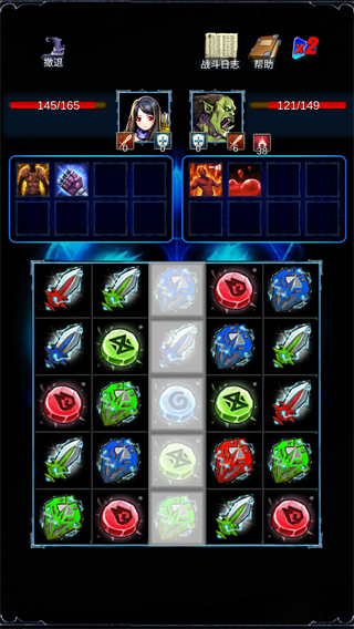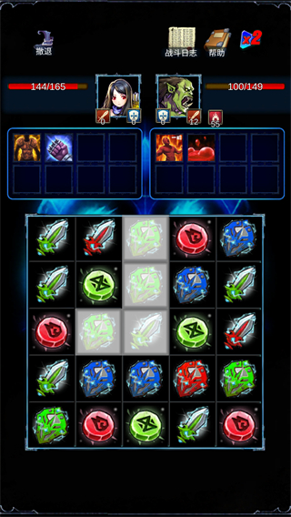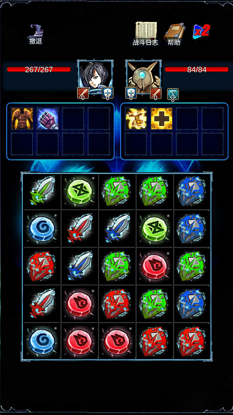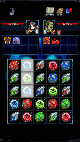 在战斗界面中,连接相同颜色或者形状的格子来进行消除。