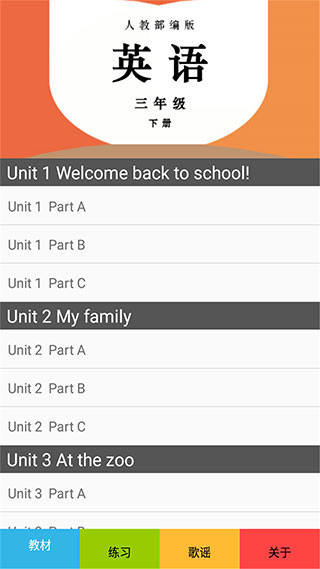 三年级英语下册人教版电子书版是专门三年级小朋友量身打造的一款英语学习软件,收录了人教版小学三年级英语下册的全部单元和每一单元的生词,可让手机立即变成随身学习机,在完全不用花时间的情况下熟练背诵所有课文,留给孩子更多的个人时间和空间。而且通过朗读的方式学习每一单元,并配有每一单元的解析,及每一单元的单词练习,除此之外,还有一些练习习题和英语歌谣供你学习,从此以后,只需三个步骤课前预习,课堂学习,课后练习,轻松进行学习,当然啦,高年级一点的也可来本站下载六年级下册英语点读人教版,打牢英语基础。
