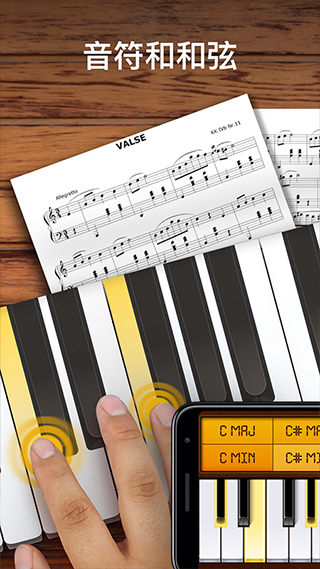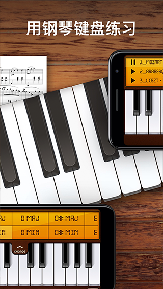 钢琴模拟器智能陪练app是一款能在屏幕上虚拟键盘按键的钢琴学习软件,app中有着真实的钢琴键盘界面,高仿真钢琴键盘,其内全界面88个钢琴键盘键,可以滑动显示完整,随意操作也能自成—派,给你超真实的弹钢琴体验。即使你不懂的五线谱,在它的帮助下依然可以弹奏出优美的音乐,玩家将如同弹奏真正的钢琴一般,触屏或外接MIDI键盘演奏,游戏内含丰富的曲目可供玩家练习,自定义调校和更多乐器让这个应用可玩性十足。曲库涵盖多种多样的音乐流派如古典,流行精选,传统和儿童歌曲,当然用户也可自行更换钢琴的音色、音源,让你的弹奏显得更专业更逼真。