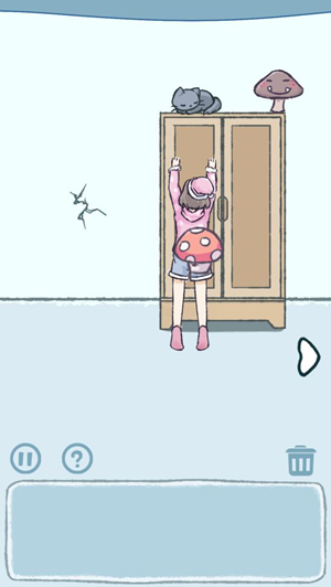 1、到右边把柜门关上,拿到红色蘑菇。把蘑菇给主人吃掉,主人就会变大把猫猫拿下来了。