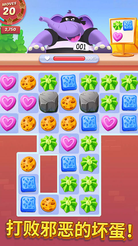 3、在过关的时候玩家们还要注意想要快速地消灭掉敌人的话,我们就要能够快速的消除掉更多的饼干,这样攻击力也会提高,玩家们就可以更快速地去消灭掉那些敌人,这样在前进的时候我们才能够有着更多的得分。