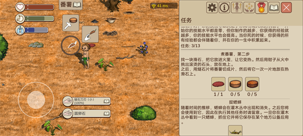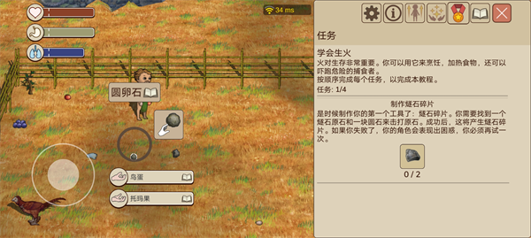 1.制作挖掘木棍,先将燧石碎片制作出来,然后在地上找到枯枝,即可制作挖掘木棍(找一块地方统一放东西,不要乱扔,尤其建议在初始地就地取材做一个石冢,方便找回来的路);