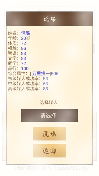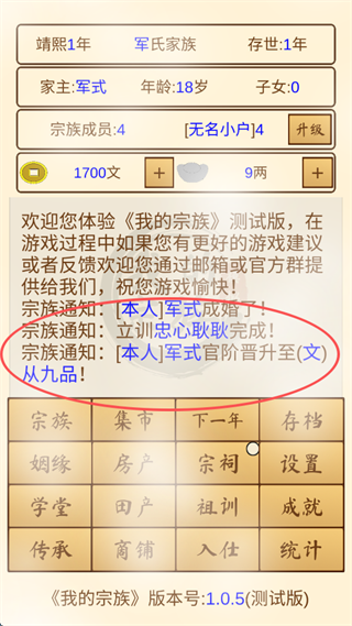 我的宗族是一款模拟经营养成类游戏,玩家将通过婚姻,传承,从商,从政等多个方面来提升自己家族的威望,将家族从无名小户发展至名门望族,流传百世。