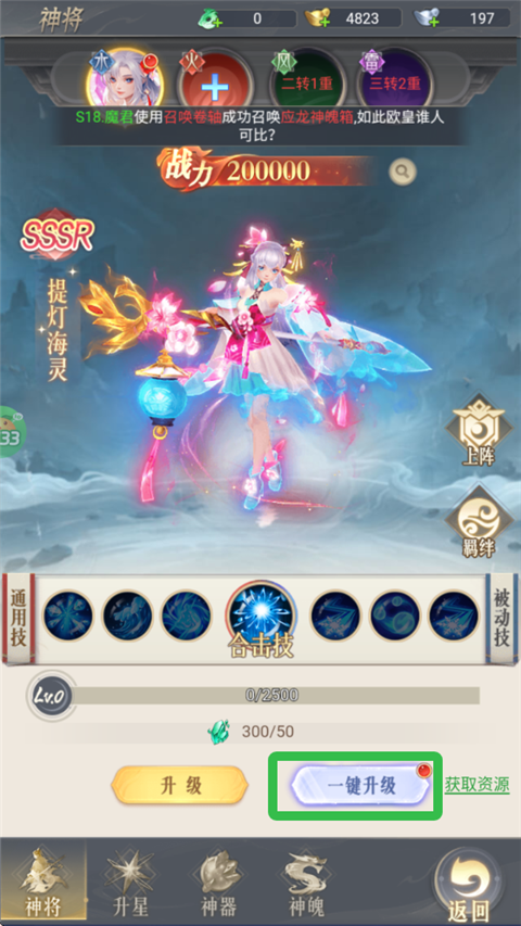 玩家可利用神将水晶为各神将升级进阶,加强其攻击力。