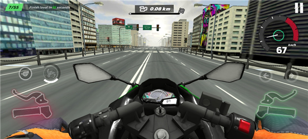 6、左右晃动手机即可控制方向,左边是减速、右边是加速,以及喇叭、翘头操作,你需要完成驾驶摩托车到终点即可胜利(失败则重新挑战,随机切换地图继续)。