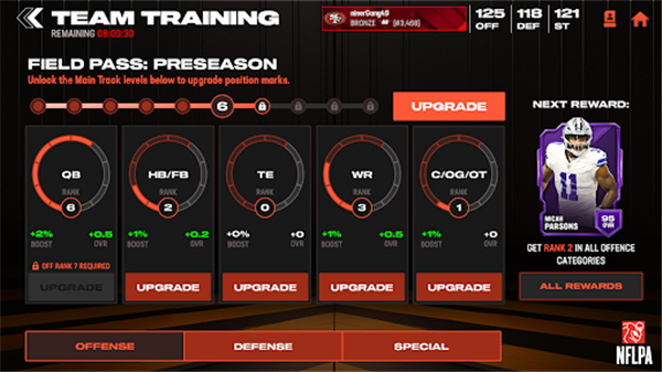 - 与顶级四分卫、跑卫和外接手交易和升级你的阵容;