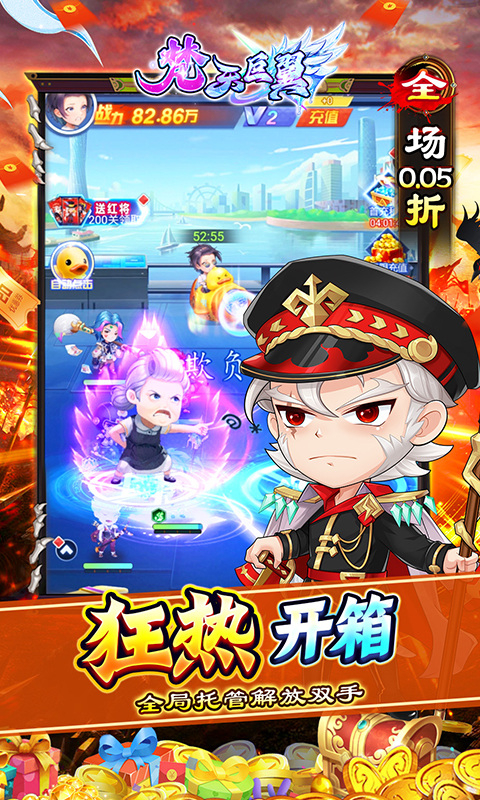 梵天巨翼折扣版是一款三国乱斗放置卡牌开箱游戏,内置无限充值卡、代充卷,全场礼包0.05折,创角领取666钻石、高级招募*5、钞票6666礼包。