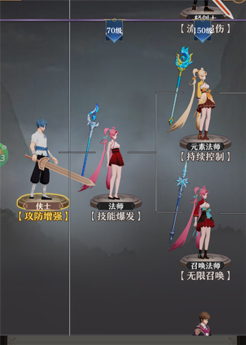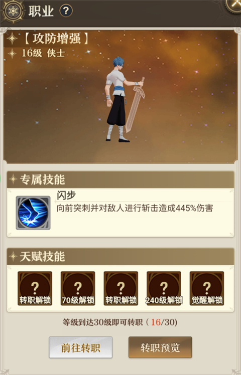 1、职业由职业转职、主动技能、天赋技能、职业觉醒组成。
