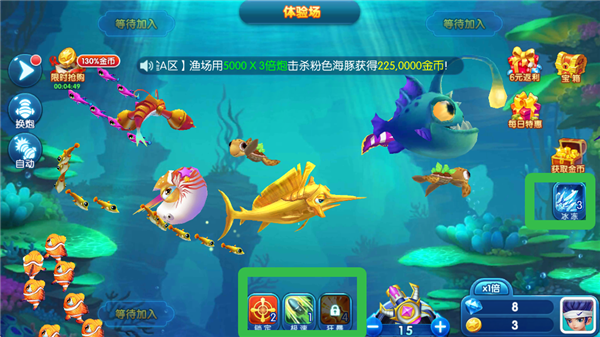 玩家可以善用冰冻、锁定、极速等道具,提高捕获高级鱼的概率。