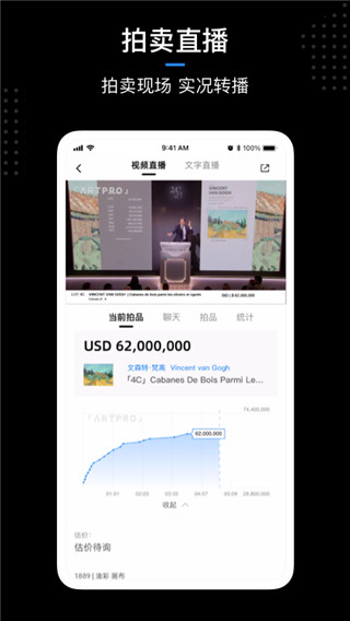 实时播报拍卖会现场实时动态资讯,宛如亲临拍卖现场;AR实景挂图,天价作品眼前呈现,随时随地品鉴细节,用科技为您打造全新拍卖体验