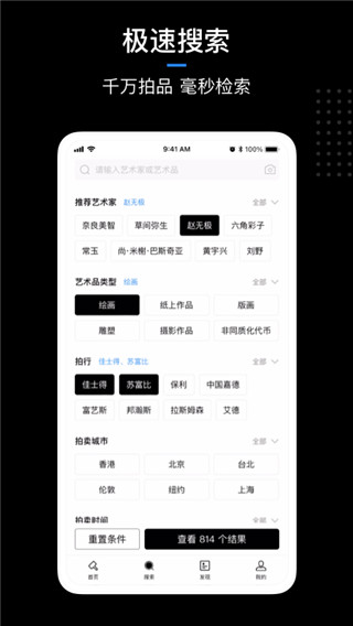 在巨量数据中,毫秒级极速查询,快速找出您感兴趣的艺术品,多维度呈现相关艺术家和拍卖会的信息,助您做出拍卖决策