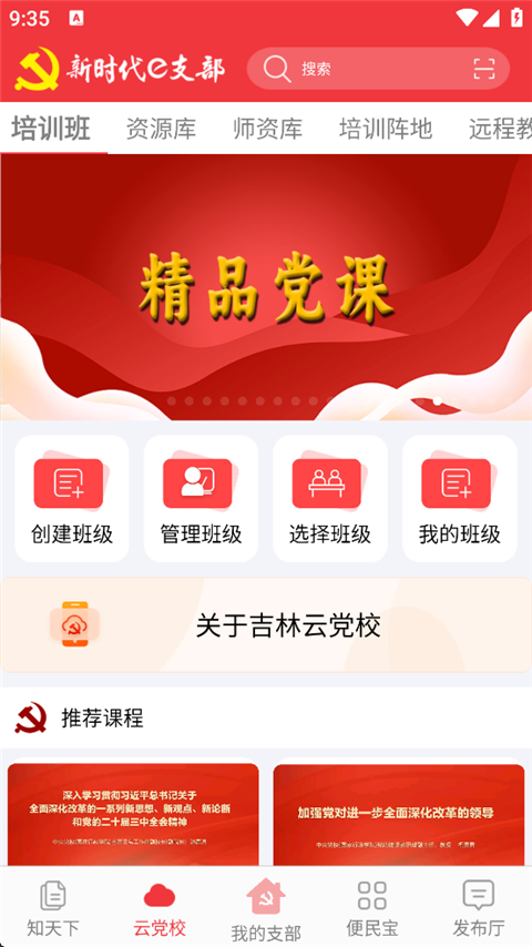 1、打开新时代e支部app,进入【云党校】页面,点击【选择班级】。