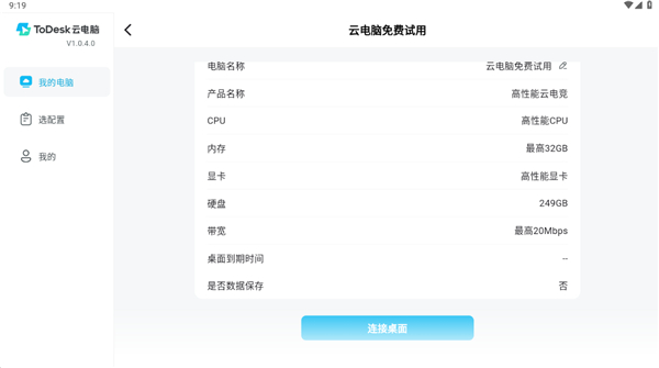 ToDesk云电脑HD版是一款专为安卓平板设备推出的云电脑应用,它不仅更适配平板大屏幕的操作体验,还提供高性能云电竞、AIGC藏宝地两种云电脑体验,其中包含多种高、中、尊享、顶级配置套餐选项,用户可以根据使用需求体验。ToDesk云电脑HD的云电竞主要适用3A游戏客户端,无需下载即可游玩,而AIGC中则是偏向于办公软件,可满足不同用户类型使用场景。