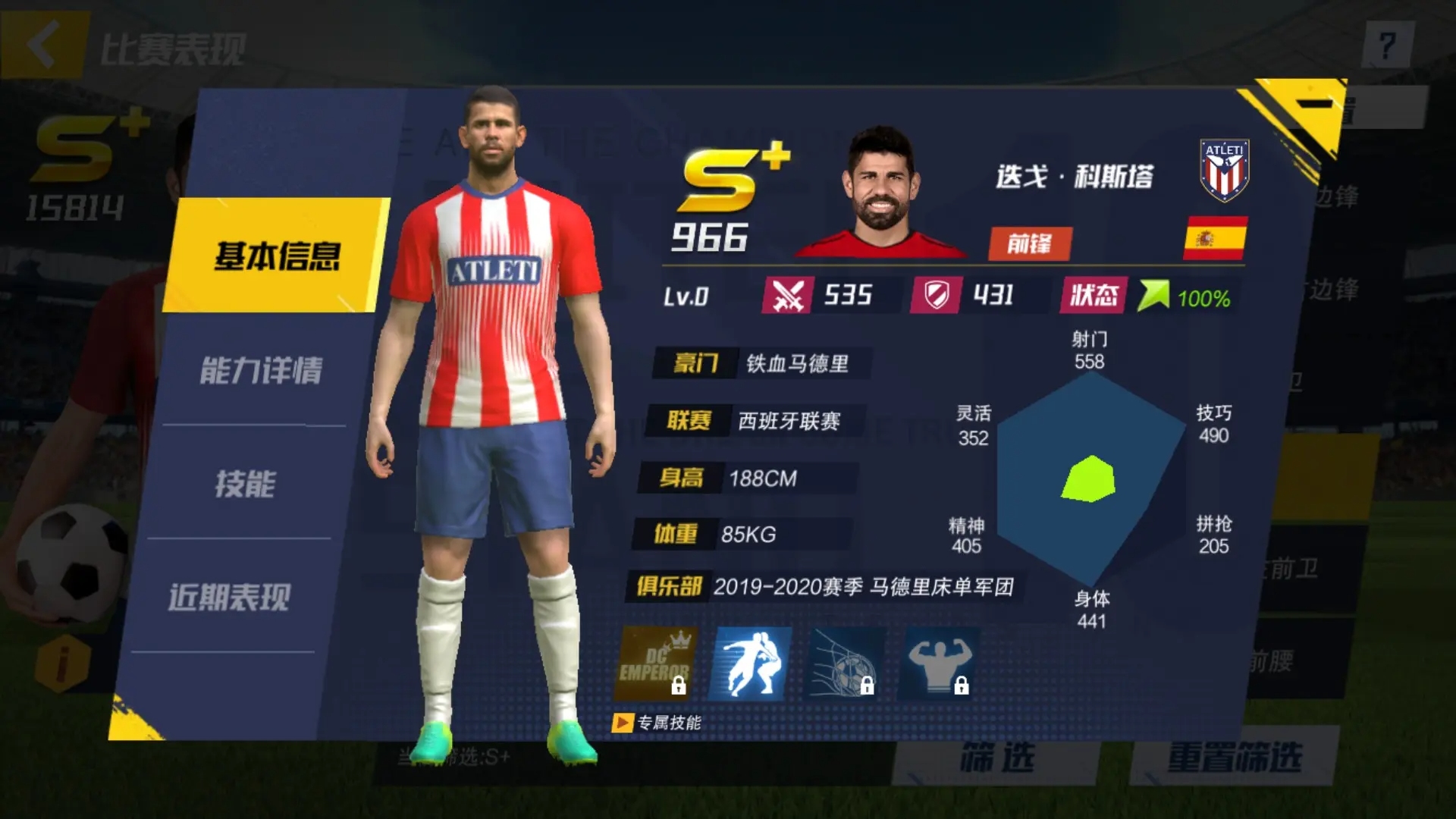 首先,阿奎罗球员技能和球员位置契合度相当高。这点很重要,在比赛时,球员技能是球队实力加成很重要的一个部分。