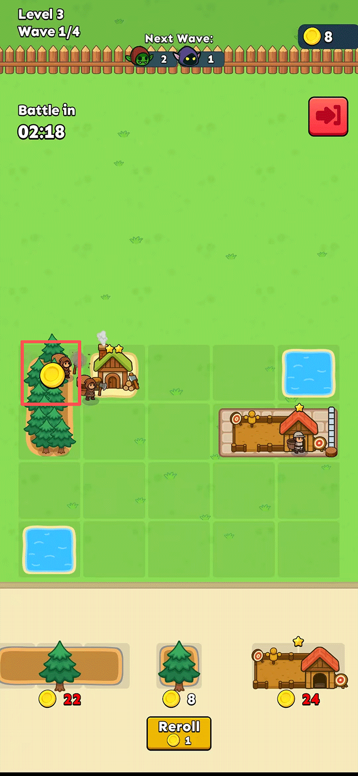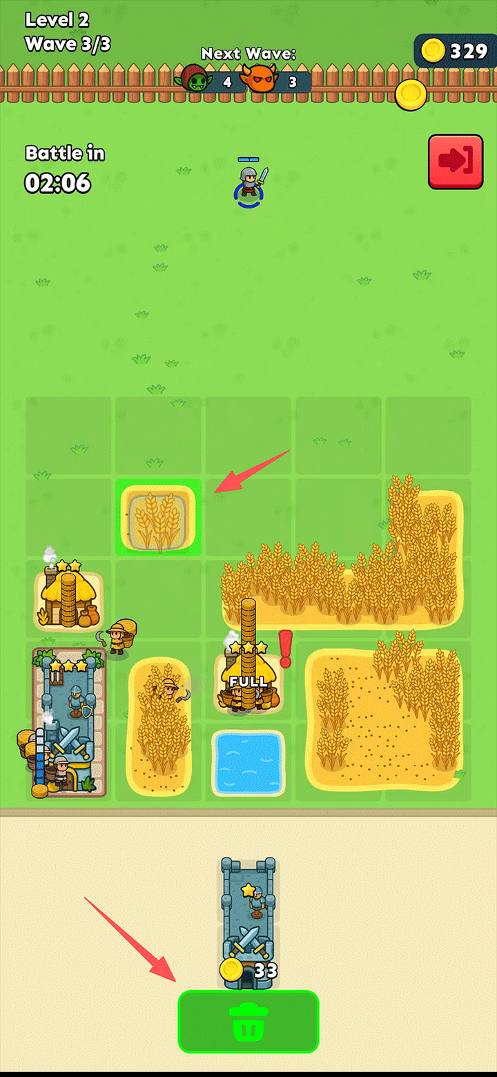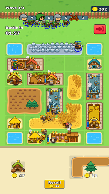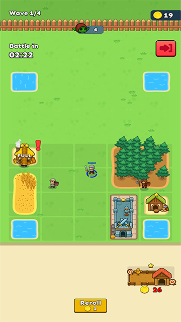 2、当房屋被放置后,会自动生成士兵与农民。农民会前往麦田收割小麦,小麦会自动转化为金币。金币数量积累到指定值后,即可解锁新的建筑设施,逐步扩展你的领地。