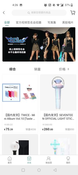 3、然后就可以进入【商城】页面,选择写真集、黑胶唱片、杂志以及美妆等分类,查找自己想要的商品。