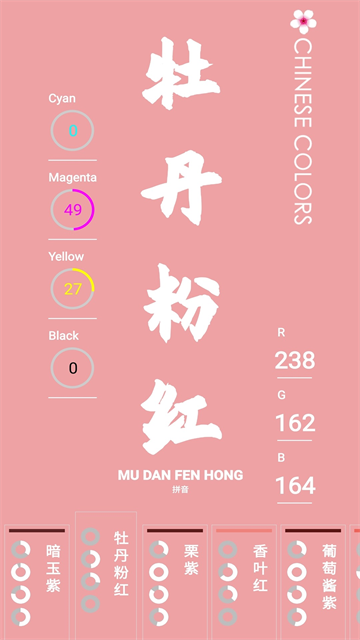 1、下载进入中国颜色app最新版之后,我们可以看见里面有各种颜色,像经典的暗玉紫,牡丹粉,香叶红等。