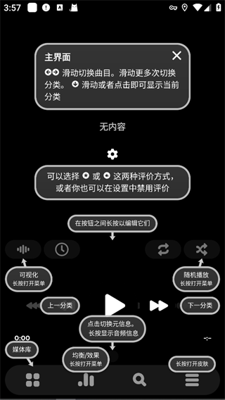 在主界面左右滑动切换曲目。滑动更多次切换分类。下滑动或者点击即可显示当前分类