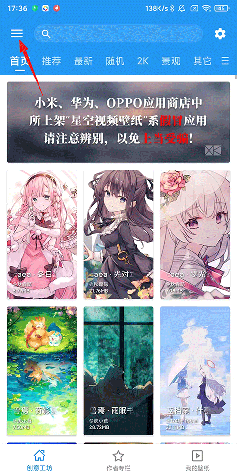 1、打开星空视频壁纸app,点击左上角的三横线扩展按钮;
