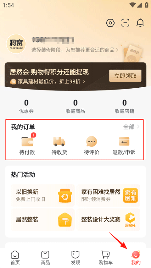 1、打开洞窝家居App,点击我的-我的订单-全部;
