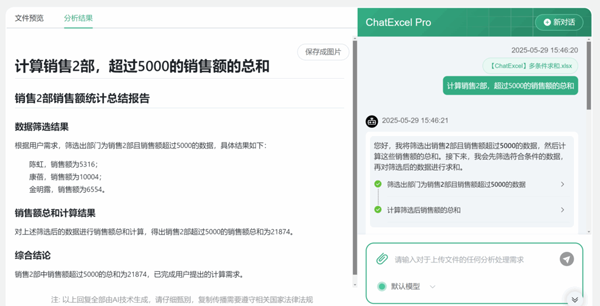 多条件求和的需求,工作中太常见了,学会下面两个小妙招,你就笑了~比如求下面表格中:1.销售2部;2.销售额大于5000,同时满足这两个条件的业务员的销售总额,则可以选择用ChatExcel一句话完成,也可以选择SUMIFS函数。