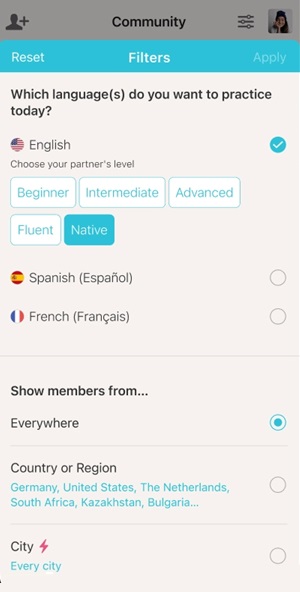 一但通过审核,进到语言交换社群,Tandem帮助你轻松找到合适的语言交换伙伴。你也能以语言、地点、兴趣等进行搜寻。