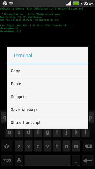 3.进入 SSH 后,长按终端以显示上下文菜单,然后选择 Snippets: