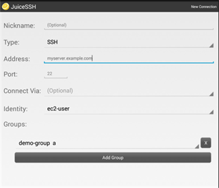 在本例中,我们假设您的服务器地址是 myserver.example.com, SSH 服务在端口 22 上运行,您的用户名是 ec2-user 并且您的私钥文件已复制到您的 Android 设备的 SD 卡.