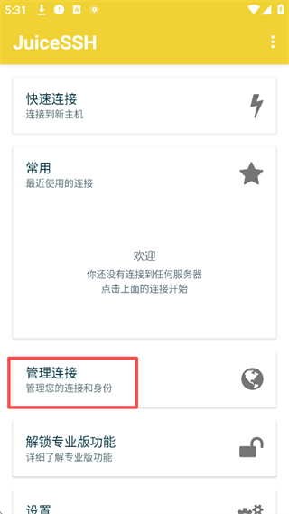1、打开JuiceSSH软件,点击首页的“管理链接”