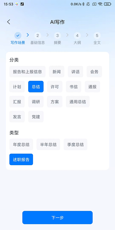 2、选择写作分类:报告、总结、新闻、讲话等,类型:年度/季度/月度总结、述职报告等,点击下一步;
