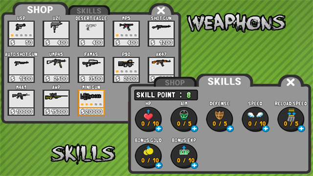 游戏里的怪物越来越多,难度也慢慢变大,一开始可能觉得很简单,但后面就会有点挑战性了。每次打到敌人会掉金币,可以用来买武器升级,比如手枪、激光枪或者弓箭。我觉得这个设计挺公平的,因为武器种类多,而且每种都有用处。