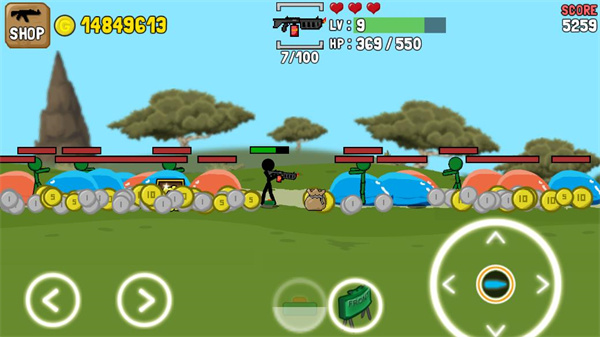 火柴人枪手英文名称叫做StickMan Gun,是以经典火柴人为题材打造的一款动作射击类手游,采用简约卡通画风设计。玩家在游戏中将操控火柴人进行射击闯关,在这期间关卡内会不断的出现各种怪物,你要做的就是不断的消灭击杀敌人来获取相应的金币奖励,而获得的金币可以用来升级购买手枪、激光枪、弓箭等武器。游戏在操作方面上还是比较简单的,采用的是虚拟摇杆移动+触屏射击的操作方式,需要两只手同时进行操作,左手控制人物的前进、后退、跳跃或是卧倒,右手决定射击点。目前游戏内提供了三种职业可供玩家自由选择,分别是枪手、弓箭手、法师。