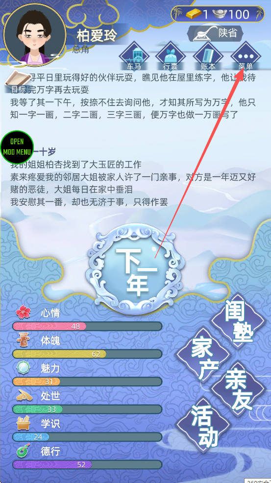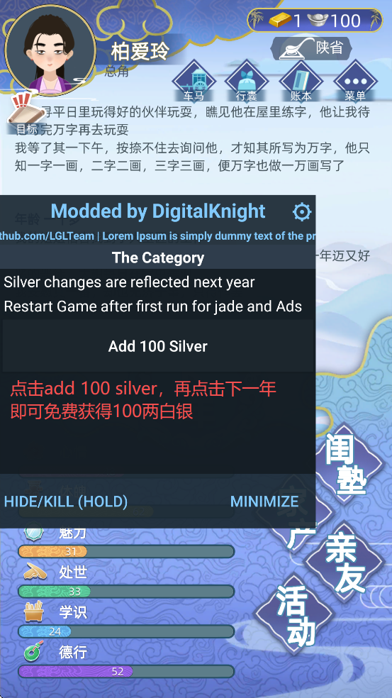 PS:本站提供的是古代人生破解版内置修改器,游戏内提供了免费的银两资源和海量玉佩资源。
