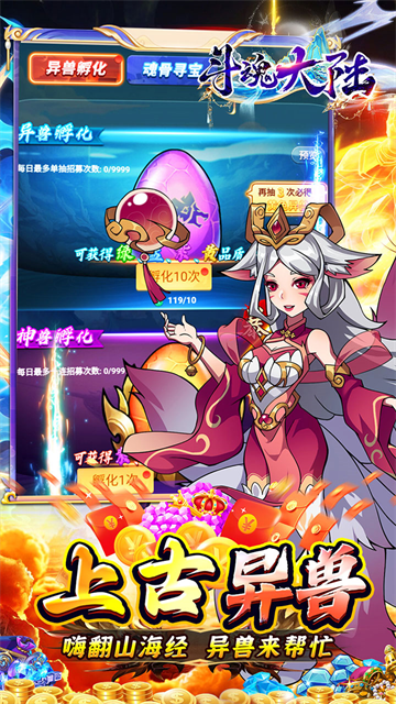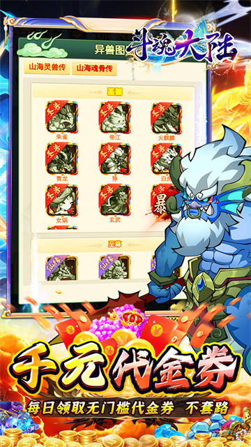斗魂大陆是一款放置挂机卡牌养成手游,玩家上线即可永久享受0.05折充值优惠,帮助玩家轻松享受游戏爽感。游戏提供了丰富多样的异兽伙伴供玩家选择,玩家可以根据异兽的能力自由组合,排兵布阵进行多等级的异兽协同作战,进化你的最强异兽,挑战各类游戏玩法,探索神奇的山海世界。