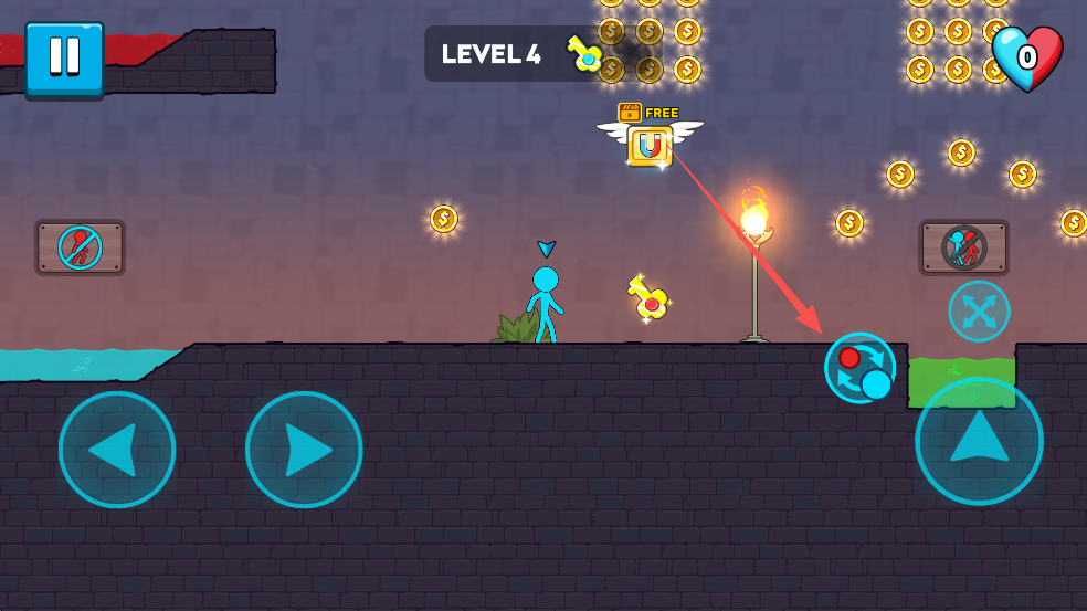 2、进入游戏后你需要一个人控制2个角色,分别是冰火柴人和火火柴人