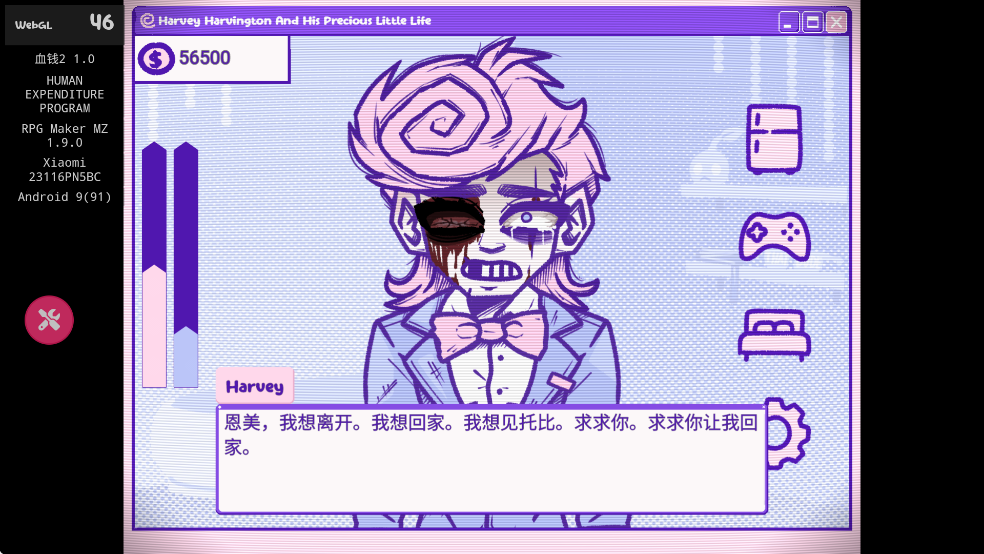 《血钱2中文版》是一款心理恐怖模拟游戏,延续了前作的角色哈维·哈文顿的故事。玩家需要在白天与他互动,通过迷你游戏赚取虚拟现金,并在夜晚做出道德抉择,影响他的生存和结局。游戏机制更复杂,节奏更快,加入了更多分支结局和情感冲击。玩起来挺有意思的,尤其是面对那些道德困境时,会让人感到压力和罪恶感。照顾哈维的过程中,你的心情值和饥饿度会影响结果,甚至可能导致他自毁或饿死。这种设计让玩家在享受游戏的同时,不得不思考自己的选择对他的影响。虽然结局有些黑暗,但这种紧张刺激的体验还是挺吸引人的。